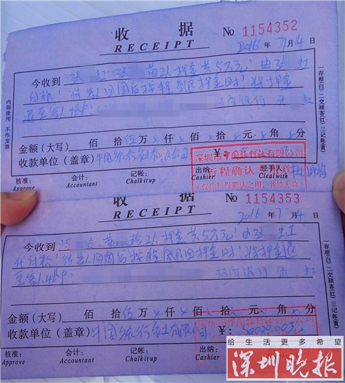 张小姐等游客的保证金收据。深圳晚报记者 李其聪 摄