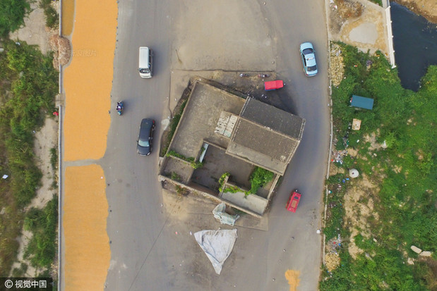 从高空俯视,该房屋占据了道路大半的路面,将宽阔的道路一分为二,最窄处仅容一辆汽车通过。
