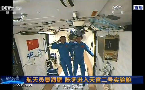 2016年10月19日报道,舱门打开,航天员景海鹏、陈东进入天宫二号。