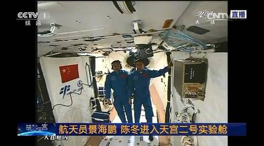 2016年10月19日报道,舱门打开,航天员景海鹏、陈东进入天宫二号。