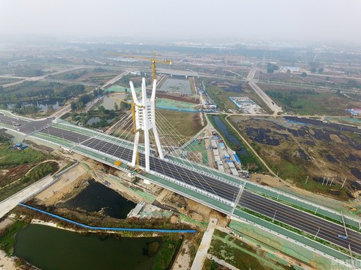 10月18日,河南省郑州市,一座即将完工的跨河桥因酷似“酒杯”引起了许多网友的热议。子君/视觉中国