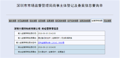 深圳大爆炸科技有限公司曾被列入经营异常名录。