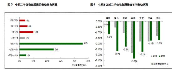据深圳中原研究中心统计,从上周业主报价的房源占比来看,将近8成二手业主下调房源价格,较上周占比增加近9个点。调价幅度在-10%~-5%区间段的房源占比扩大5个点,达到24.9%,同时调价幅度在-5%~-1%的样本房源占比也在增大,增大近3个百分点,占比达到46的水平。