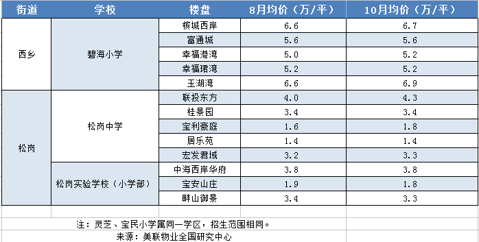 通过美联物业全国研究中心提供的数据来看,自宝安区公布7所实行学位房锁定制度的学校名单后,这些学校覆盖的楼盘绝大多数都出现了一定比例的变动,但变动幅度并不大,基本都是在每平1至3千块的范围内浮动。其中涨幅最高的宝利豪庭,则因其本身为均价1.6万/平的价格洼地,在12.5%的涨幅下,现价也并不亮眼。