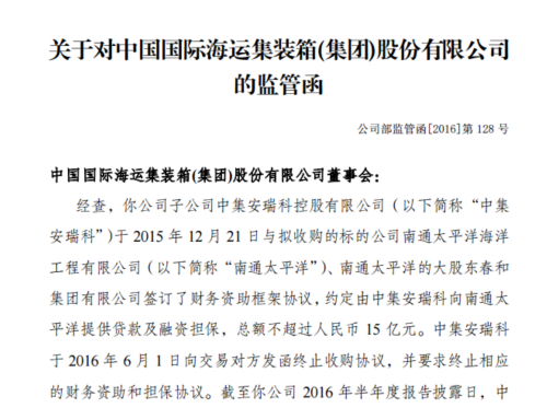 监管函显示,2015年12月21日,中集集团子公司中集安瑞科与拟收购的标的公司南通太平洋海洋工程有限公司、南通太平洋的大股东春和集团有限公司签订了财务资助框架协议。