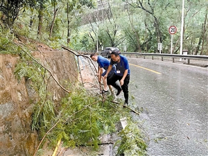 21日上午,“海马”登陆前,黄伟营和工作站的同事在清理倒伏树木。 田东社区工作站供图
