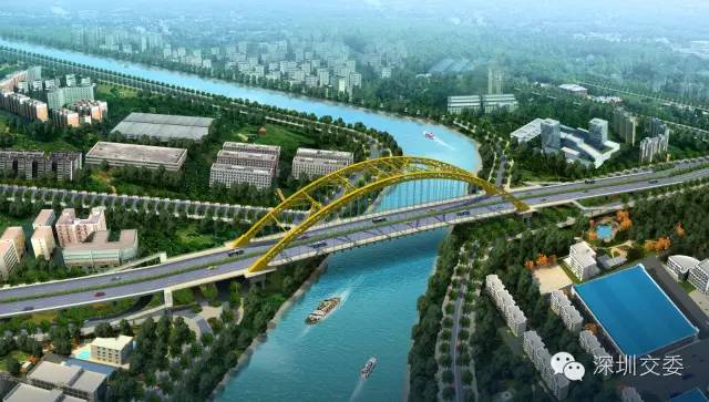 桥梁跨越沙井河采用了一跨跨越,净跨182米,桥宽34.2米,为目前深圳市市政工程单跨跨径最大的桥梁。桥梁采用了下承式钢管混凝土刚架系杆拱桥,双拱肋设计,每条拱肋由四根直径1米的钢管混凝土主弦管组成,全桥共设10道K字型横向风撑;桥面系采用了纵横向钢结构格子梁体系,桥面板为钢-混凝土组合桥面结构。全桥共设20对吊杆,吊杆间距8.55米,吊杆采用整束挤压环氧涂层钢绞线。