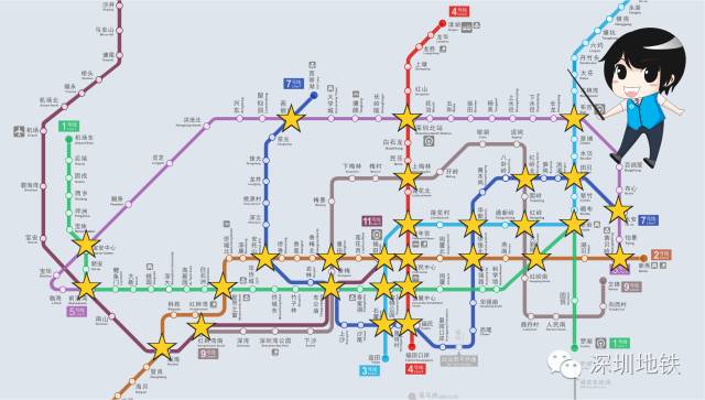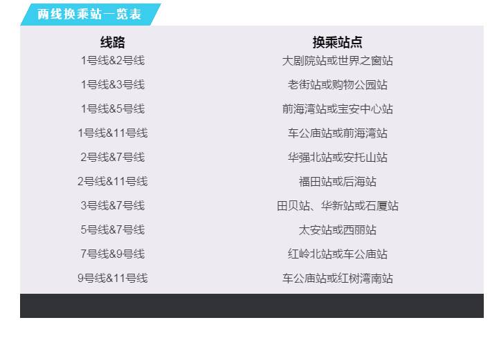 目前,车公庙站是在全线网中唯一一个四线换乘站,1、7、9、11号线在此站交汇;三线换乘站共有两个,分别是前海湾站与福田站。 前海湾站是1、5、11号线的换乘站,福田站则是2、3、11号线的换乘站, 其余25个车站均为两线换乘。