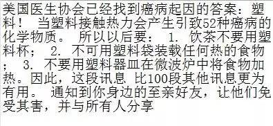 真相:美国医生协会并不存在,且这样的说法也是无中生有。目前并没有证据能直接证明塑料加热与致癌之间存在着必然的联系。