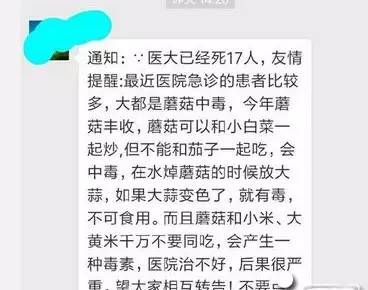 谣言内容:“今年蘑菇丰收,蘑菇可以和小白菜一起炒,但不能和茄子一起吃,会中毒,在水焯蘑菇的时候放大蒜,如果大蒜变色了,就有毒,不可食用。”