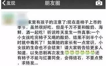 谣言内容:“家里有孩子的注意了:现在是柿子上市的季节,虽然很好吃,但是千万不要和酸奶,海鲜,酒一起吃!一个小女孩吃完柿子又喝酸奶,结果不到半个小时就中毒死了!”