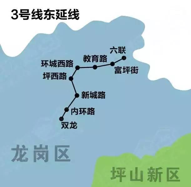 深圳地铁3号线延长线东延段站点:双龙、内环路、新城路、坪西路、环城西路、教育路、富坪街、六联