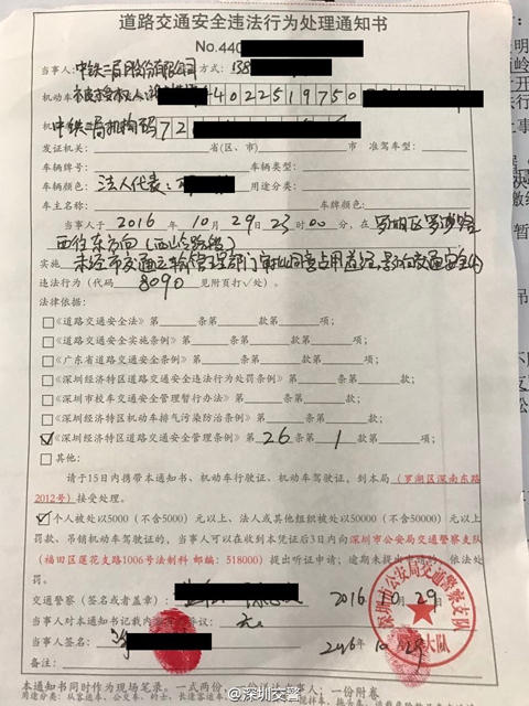 根据相关调查情况及《深圳经济特区交通安全管理条例》相关规定,深圳交警依法对违法施工的中铁二局股份有限公司处以五万元罚款。