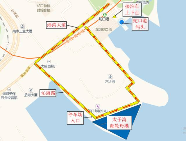 为方便乘客,已在现客运码头站前广场设立免费接驳巴士站点——乘免费接驳巴士从蛇口客运码头前往蛇口邮轮中心: