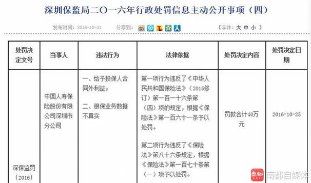 10月31日,深圳保监局在其官网公布行政处罚决定书显示,因中国人寿保险股份有限公司深圳市分公司经营过程中存在给予投保人合同外利益和银保业务数据不真实两项违法行为,深圳保监局依法对该公司给予罚款40万元。