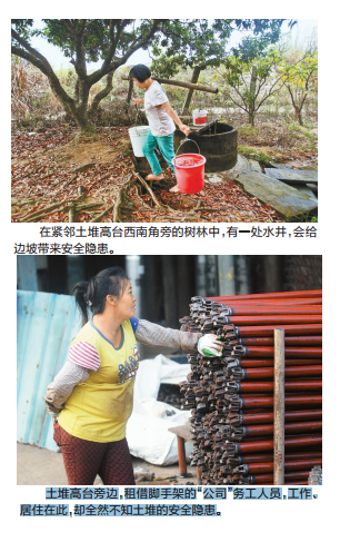 这处平地,看似宽敞安全,其实不然。记者在其东侧与南侧坡边发现,未被杂草覆盖的裸露坡面显示,此处高企的平地实际是由余泥渣土、建筑废料以及各种垃圾所堆起的,木板、玻璃、编织袋、大块建筑废弃石块等物夹杂其中。在整个土堆高台的旁边,紧邻一处出租钢制脚手架的“公司”,土堆高台与公司相隔不过1米左右。而土堆高台之高,几乎与该“公司”两层板房齐平。