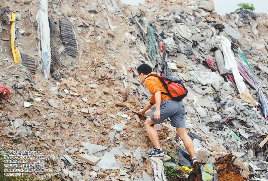 深圳新闻网讯 大块建筑废弃石块、木板、玻璃、编织袋等物,堆起近两层楼高的坡体。坡体松软,尽管记者小心翼翼,只爬了几步便滑落下来。(拍摄于该土堆高台东侧边坡)