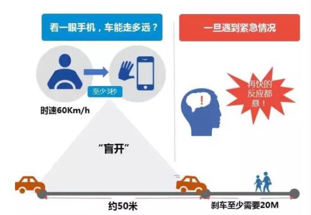 对于那些开车玩手机的朋友来说,车速60km/h时,低头看手机3秒,相当于盲开50米,一旦遇到紧急情况,刹车至少需20米。下面这张图相信许多人都看过吧?然而引起重视的又有多少人呢?