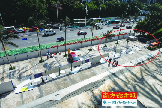 豪方悠然居小区门前停车场一处空地被规划为地铁九号线南海大道支线四海站进出站口(红圈处),遭小区居民反对,围挡被推翻。记者徐文阁 摄