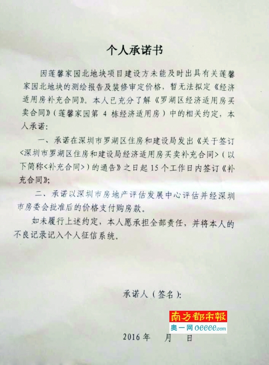 这份承诺书表示,因莲馨家园北地块项目建设方未能及时出具对应的测绘报告及装修审定价格,暂无法拟定《经济适用房补充合同》。承诺书要求,承诺人须在住建局发出签订《补充合同》的通告后15日内签订《补充合同》,并承诺以深圳市房地产评估发展中心评估、并经深圳市房委会批准后的价格支付购房款。