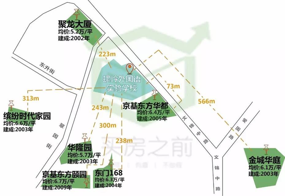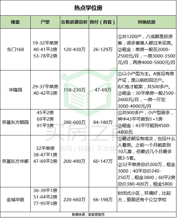 学位房情况:片区房源单价大多在5-7万/平,成交比较活跃的有东门168(每月平均8套)、华隆园、东方颐园、东方华都(每月平均5套)、金城华庭。整个学区内最便宜的是东门168的19平户型,学位用过的总价120多万,没用过的140万。一般学位锁定与否差价5-8万。