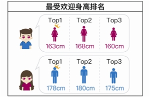 受访的单身男女性还给出了他们最期望的身高,178厘米、180厘米和175厘米的男性最受女性欢迎,而男性则更中意身高163厘米、168厘米和160厘米的女性。