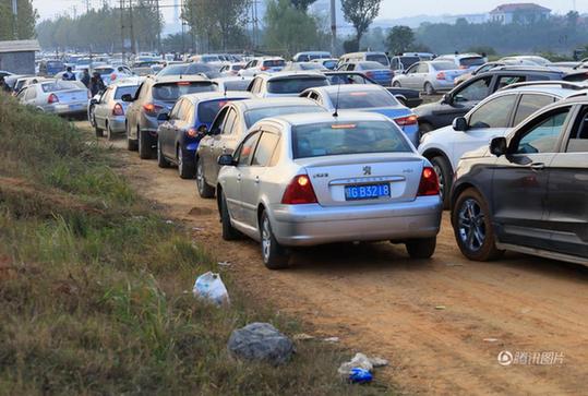 近千辆私家车拥堵在湖边,导致本已狭窄的道路缓慢前行,前后拥堵超过两公里多,交警不得不临时出动指挥交通。赖慧/视觉中国