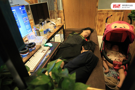 图为2016年6月,一对小夫妻从新乡长垣来郑州打工,因为房东涨房租住不起,就带着10个月大的女儿,搬到了网吧,一住就是大半月时间。视觉中国