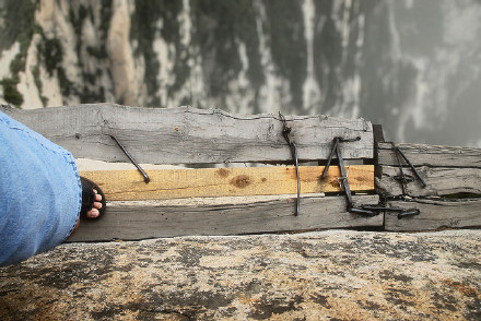 主要是在悬崖旁边修建的,还是用木头,铁链拴在一起的,下面就是万丈深渊,非常吓人。