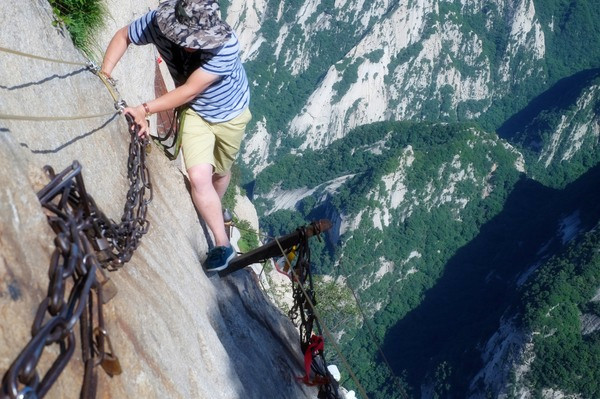 这个没有栏杆,而且很窄,很多地方甚至直接是在岩壁上面开孔走过的。