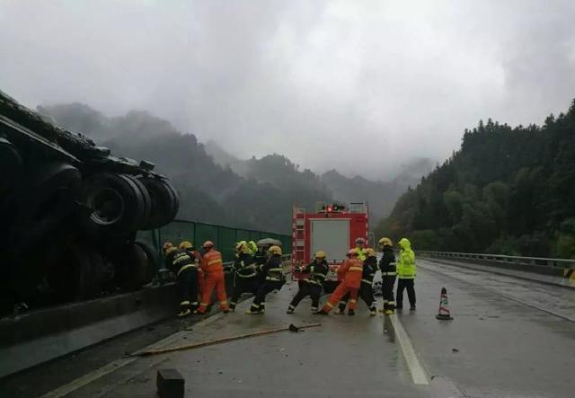 8日14时40分许,湖南省高速公路交通警察局邵阳支队洞口大队民警接到过路司机报警,称在沪昆高速东往西1362公里处的高架桥上,有一台重型半挂牵引车冲破护栏,车头悬挂在半空中。民警火速赶往现场,并通知消防、医院、施救队参加救援。在高速交警、消防队和施救队的协助下,16时,两名驾驶员被成功救出。