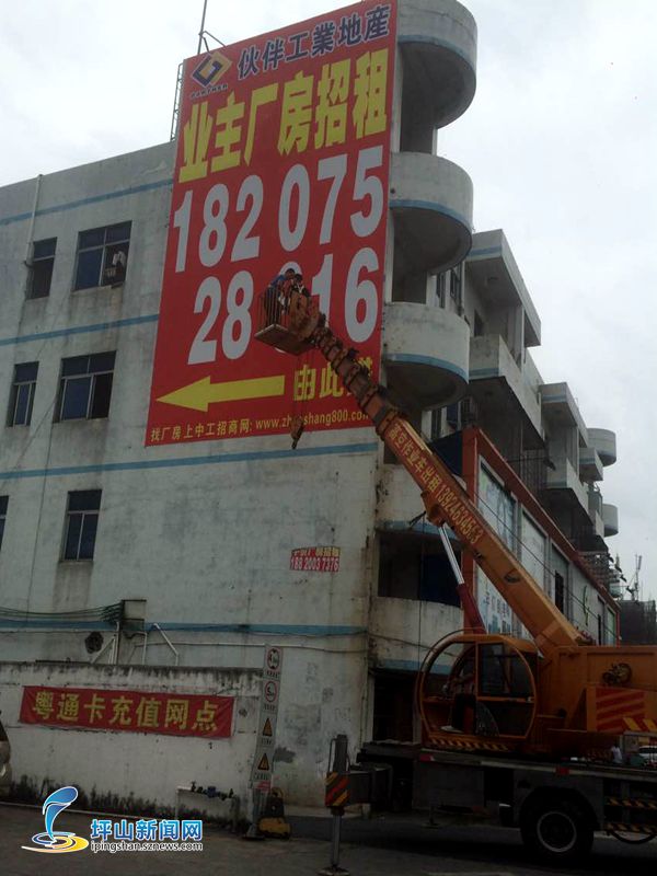 11月8日,坑梓办事处执法队派出50余名执法人员对坪山新区中轴干线坑梓段进行综合整治。沿线1056号门面墙壁上有乱张贴现象,执法人员停下脚步进行清理。沿路某汽贸店铺六楼楼顶悬挂了广告牌,执法人员立即与店铺老板沟通,对楼顶广告牌进行拆除。大家沿路巡查,发现一处就处理一处。