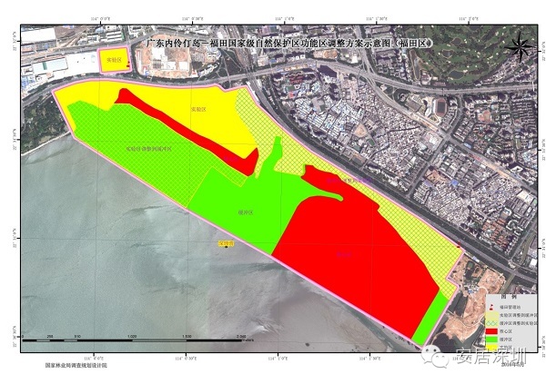 福田红树林片区实验区调整到缓冲区区域为西部核心区的南侧实验区,面积63公顷,全部为滩涂、浅海水域。