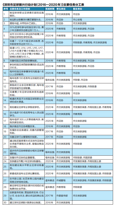 对此,计划也给出了一个时间表。2016年底前,完善职业足球俱乐部扶持措施;到2018年,力争拥有中超、中甲和中乙球队,并形成校园足球队、深圳市代表队、深圳市职业足球队的三级队伍结构;到2020年,50%的学校参与校园足球计划,青少年注册球员总数达到1万人。