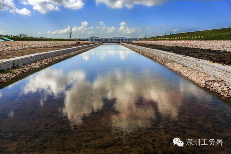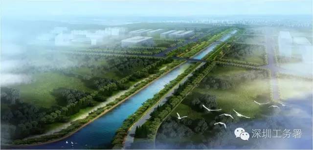 双界河水廊道位于前海片区的最北端,东起月湾河,自东向西汇入前海湾,是宝安区与前海片区的分界线。双界河水廊道工程总长约1.69公里,主槽宽30-35米,主要建设内容包括河道防洪工程、水质改善工程、景观绿化工程,形成河道主槽后,保证河道的行洪及防风暴潮安全,为后期景观设计预留空间。