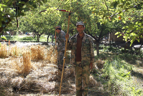 火力普与同伴在一小块被杏林包围的麦地里割小麦,他们要赶在中午变热前完成收割。小麦收割完后不再需要人工脱粒,晒干后打捆,填进脱粒机。这种收割方式,也和内地不一样。