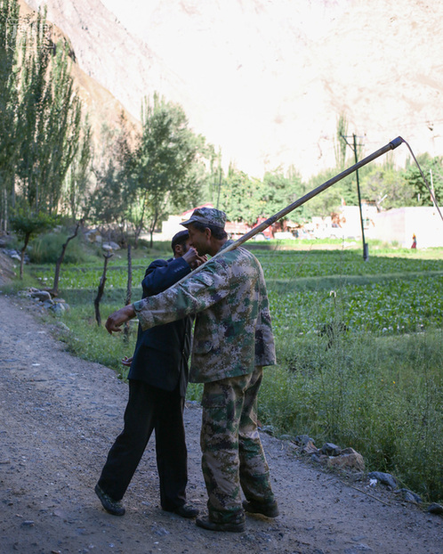 接近中午,火力普抗着镰刀回家,路上遇到同村的朋友,行塔吉克族男人与男人间的见面礼:互相握手,然后俯身互吻对方手背。