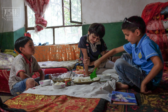 傍晚,阿依力江的朋友来家里做客。阿依力江的妈妈蒸了平时不常吃的蔬菜和米饭。饭前,比娜热汗会帮妈妈将餐布铺在床沿上,一家人围在一起吃饭。