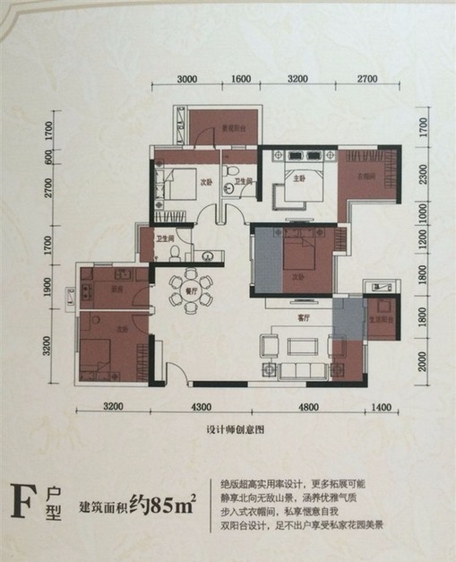 △笔架山公馆85㎡四房户型图,灰褐色部分为赠送面积