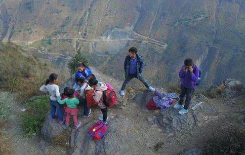 历经一个多小时后,孩子们在最后一个休息平台休息,再走几百米平缓的土路,就到达最后两段垂直高度一百多米的铁梯。