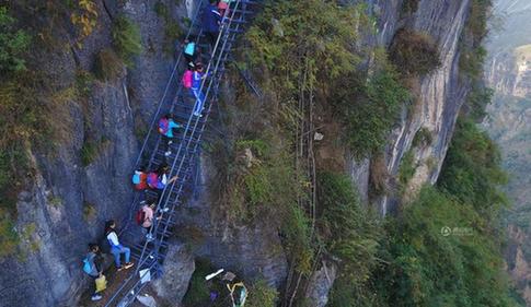 孩子们攀登最后两段垂直高度一百多米铁梯。