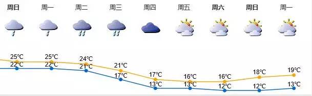 22日高空东南风加大,降雨明显,部分时间雨势较大;23日受明显冷空气影响,频密降雨逐渐减缓,北风加大,气温骤降;24-25日有零星小雨,天气阴冷。
