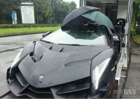 这辆兰博基尼Veneno敞篷版,全球限售9台,是最强超跑之一。170万美元起售价的阿斯顿马丁one77 来到中国卖4700万。全球就9辆敞篷版可惜的是下雨天需要有人帮忙撑伞。