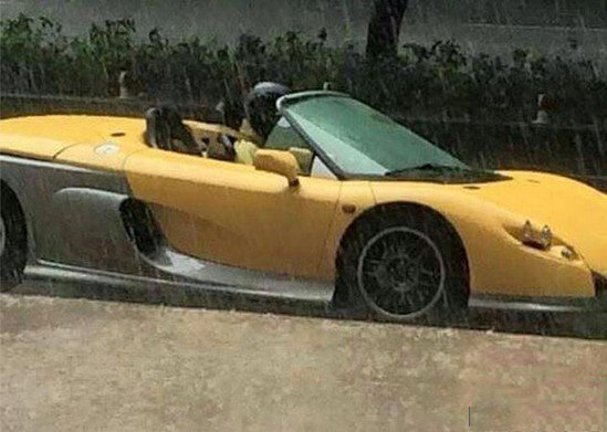 如果觉得打伞太low,好吧,其实穿雨衣也行。台湾多雨,这位土豪穿着雨衣、戴着头盔也要开着敞篷跑车出门。