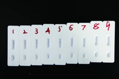 9个样品检测黄曲霉毒素B1,均呈阴性(出现两条红线),证明全部符合国标限量标准