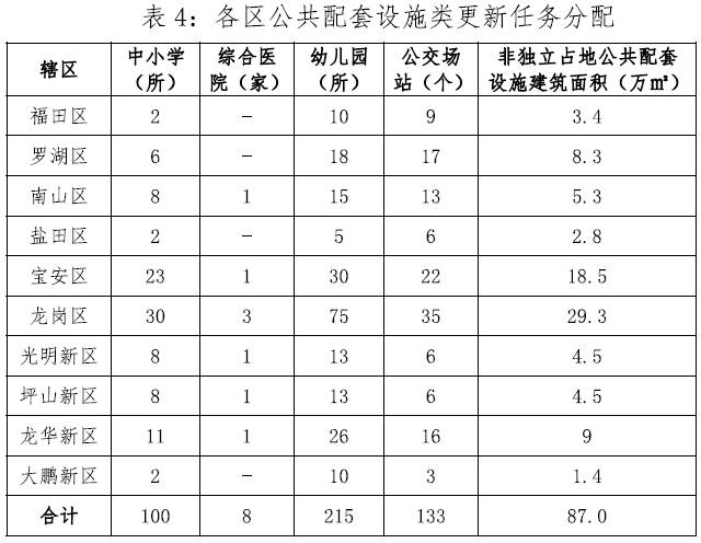 “十三五”期间争取在城市更新单元规划阶段新增一批公共配套设施,其中规划批准中小学不少于100所,综合医院不少于8家,幼儿国不少于215所,公交场站不少于133个,非独立占地的公共配套设施建筑面积不低于87万平方米。