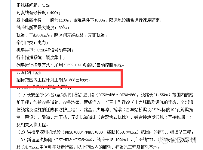 相比于东莞、广州,深圳段的开工时间相对靠后,在2014年,才进行了项目招标并开工,在招标公告上,我们看到工期的计划时间为:1308天!