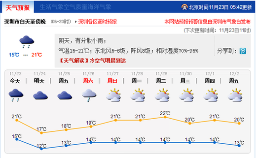 进入11月以来,深圳冷空气越来越频繁,去年11月深圳国家基本气象站的最低气温为12.7度。预计,11月下旬~12月中旬深圳气候将呈"天气转冷,气温波动大,雾霾增多"特点。