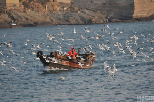 2016年11月23日,山东省青岛市白天气温降至-1.7℃低温,受冷空气影响,浅水鱼虾减少,大批越冬的海鸥集中在渔港附近与人抢食海鲜,以补充体能躲避严寒。据青岛市气象台信息,当日16时00分继续发布大风蓝色预警信号:受冷空气影响,预计今天下午到明天上午,我市北风风力陆地可达4~5级阵风7级,海上6~7级阵风9级。夜间温度降至-2 ℃。2016年11月23日,山东青岛,越冬红嘴鸥跟随进港的渔船抢食鱼虾。图片来源:视觉中国王海滨/视觉中国