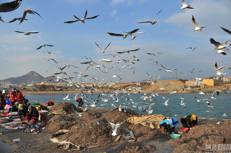 2016年11月23日,冷空气影响青岛,大批越冬红嘴鸥集中在渔港码头附近抢食鱼虾,以补充体能躲避严寒。图片来源:视觉中国王海滨/视觉中国